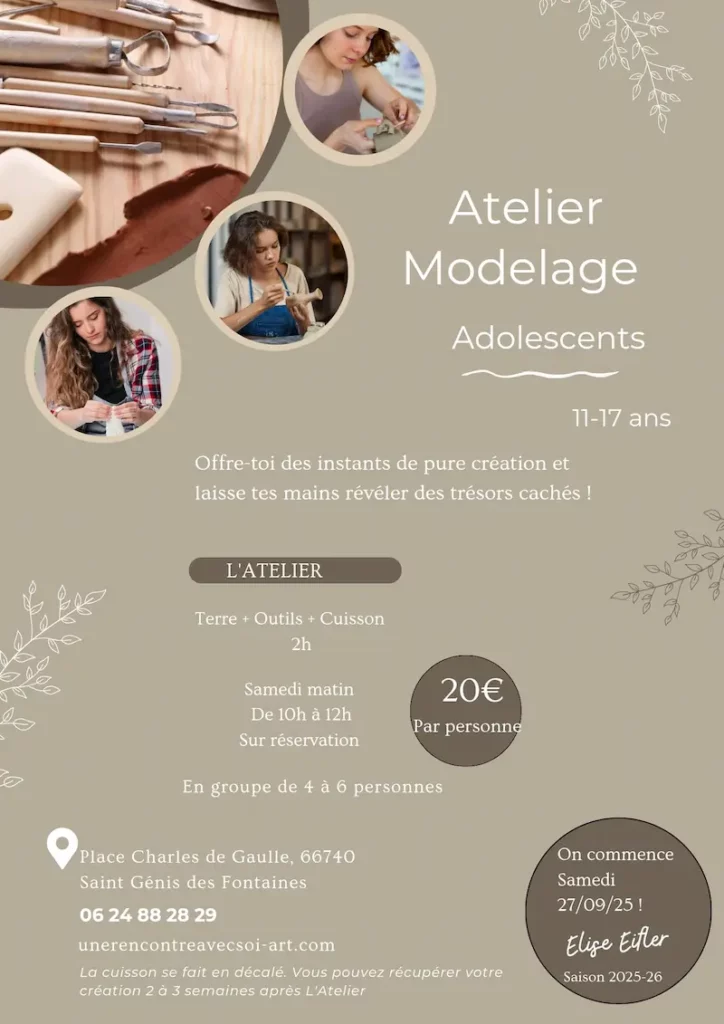 Si vous souhaitez un « Atelier Modelage Adolescents » sur un autre créneau horaire, n’hésitez pas à me contacter sur mon téléphone afin de s’organiser! (06 24 88 28 29)