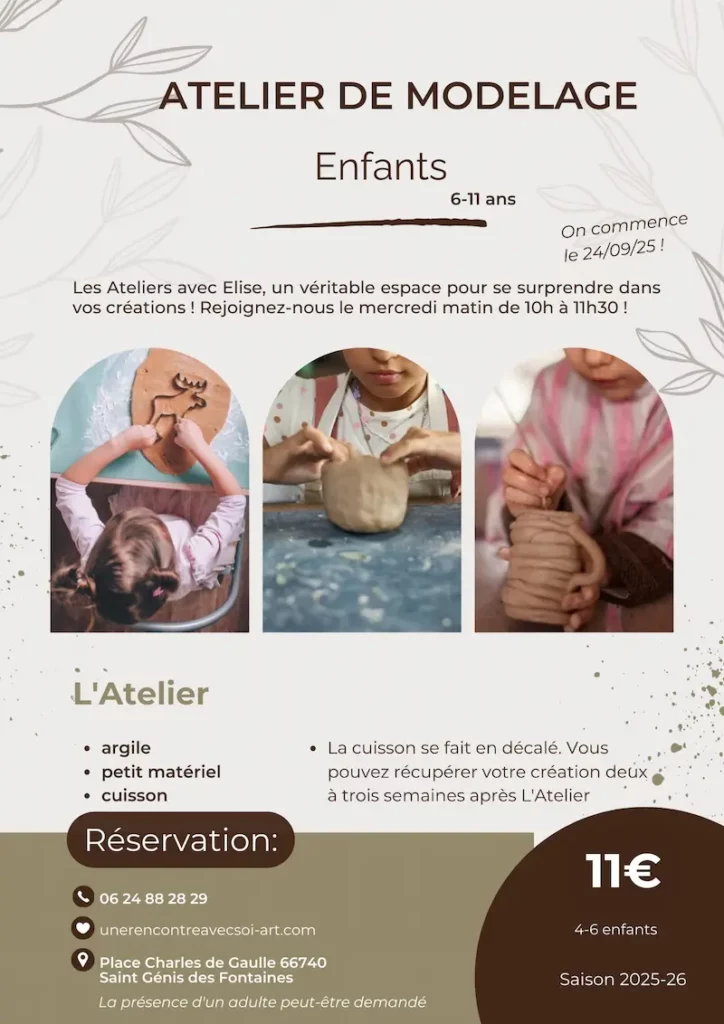 Si vous souhaitez un « Atelier Modelage Enfants » sur un autre crĂ©neau horaire, n’hĂ©sitez pas Ă me contacter sur mon tĂ©lĂ©phone afin de s’organiser! (06 24 88 28 29)